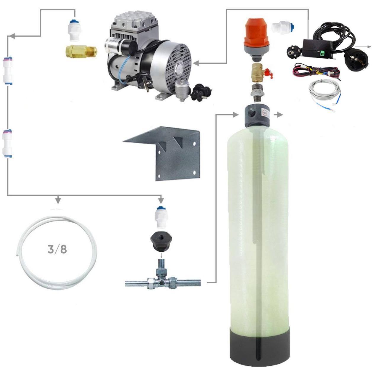 Напорная аэрация подразумевает отсутствие потери давления в трубопроводе. При напорной аэрации воды воздух при помощи компрессора или эжектора подается в трубопровод. Далее водо-воздушная смесь подается в контактную камеру: напорный корпус или на статический миксер, обеспечивающий необходимое время контакта. Из контактной камеры вода поступает на систему фильтрации практически без потери исходного давления. При использовании напорной аэрации воды в верхней части контактной камеры устанавливают воздухосбросный клапан для удаления лишнего воздуха и удаленных из воды газов. Контактная камера, распределительный оголовок с трубками и восдухосбросный клапан в сборе называются аэрационной колонной.